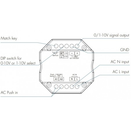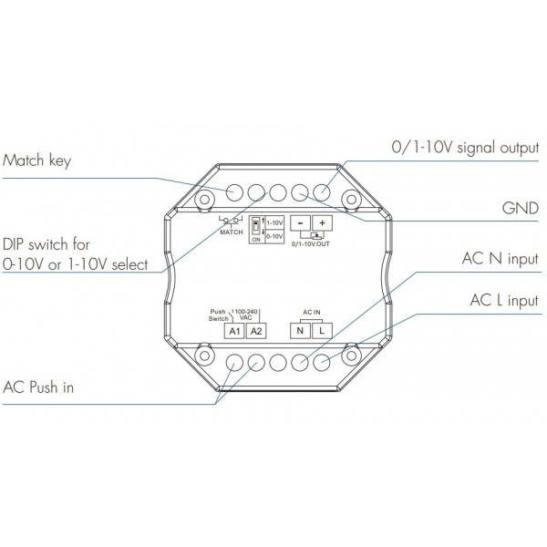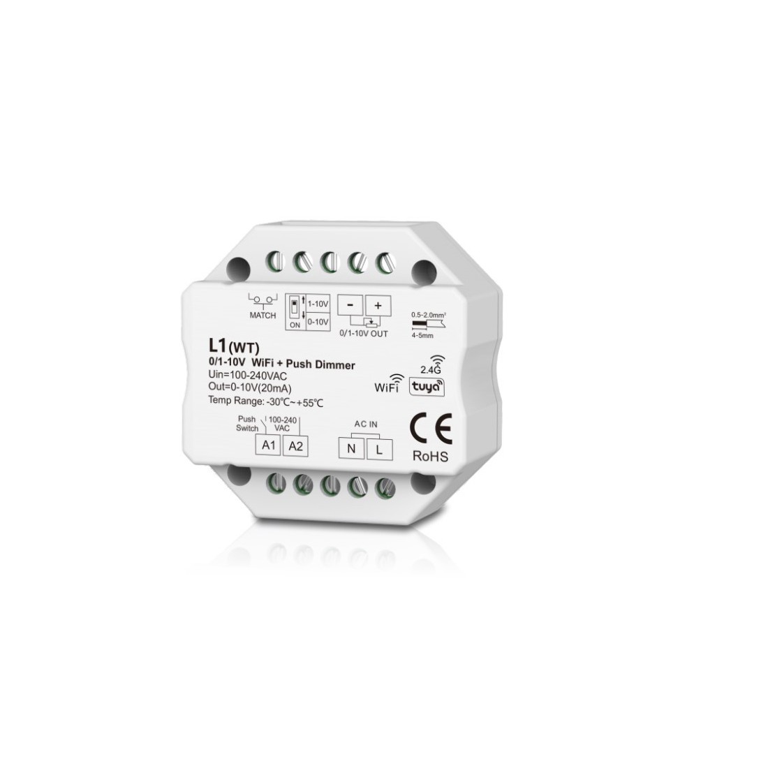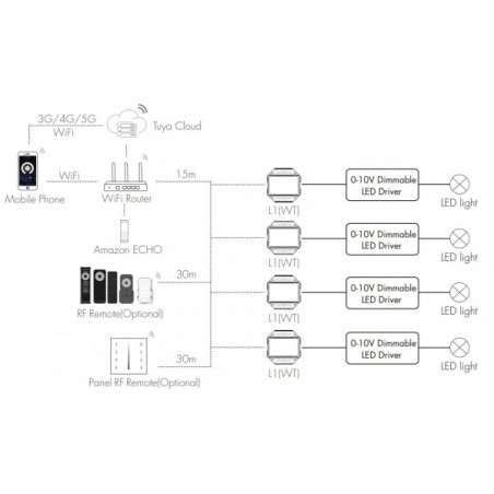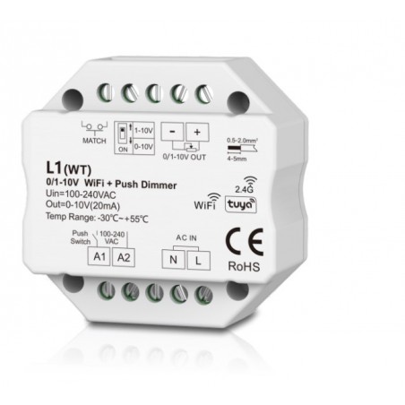 0/1-10V WiFi + RF + PUSH valdiklis, veikia per WIFI ir TUYA, 1 kanalo, 256 lygių 0-100 % tolygus dimeriavimas, be jokių blyksnių.