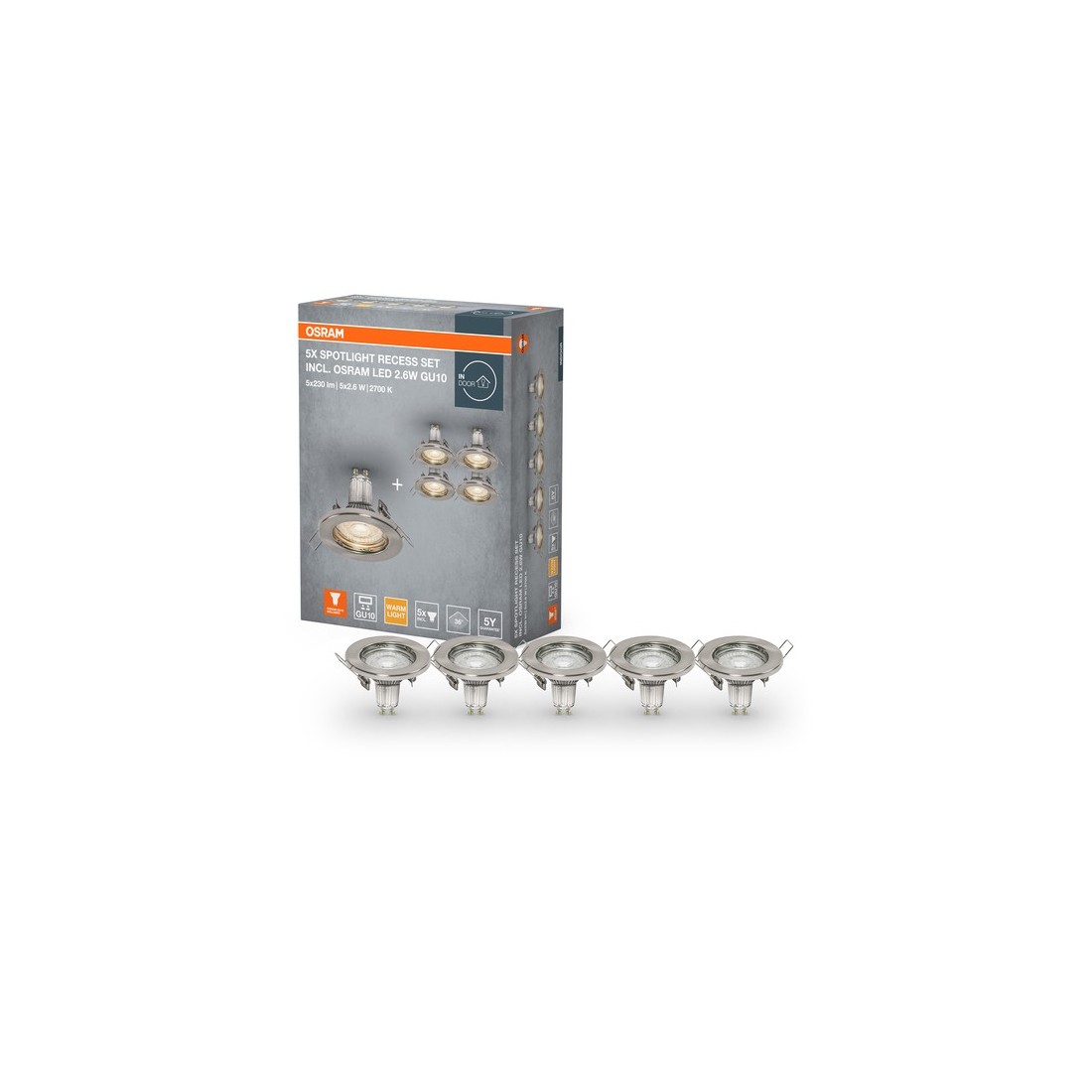 Įleidžiamas šviestuvas SPOT, GU10, šlifuoto nikelio sp., su 2,6W 2700K LED lempute, 5vnt. rinkinys