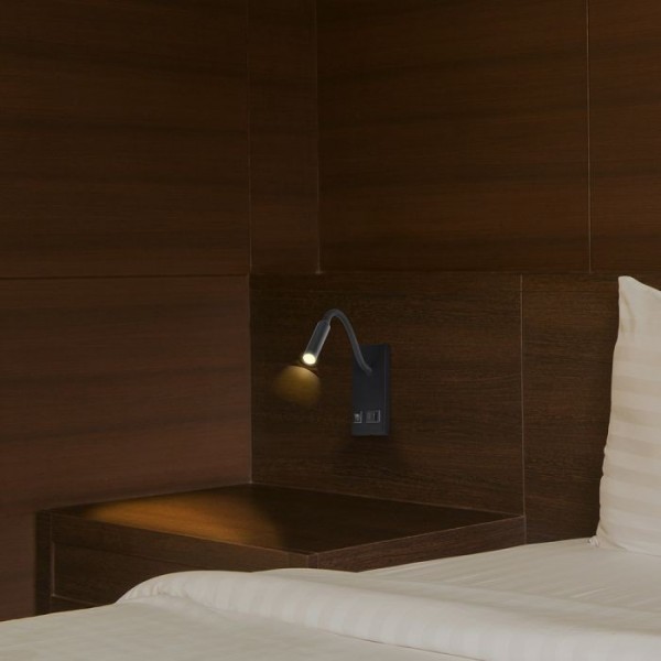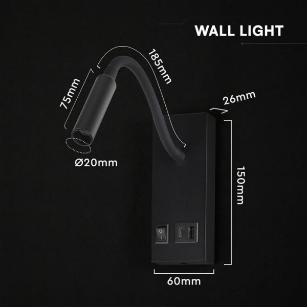 3W LED sieninis šviestuvas - skaitymo lempa, juodas, 3000K, su USB/PD jungtimi, CREE LED chip
